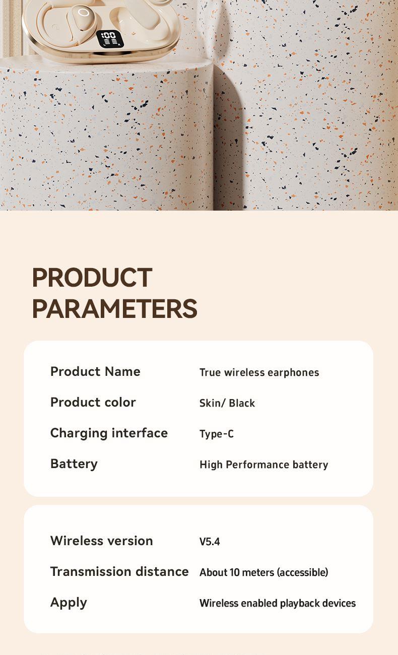皮纹电镀OWS开放式耳机 型 号: M96 产品颜色:肤色、黑色 带包装重量:113.5g 外箱尺寸:48.5*41*25CM 整箱数量:100 PCS 整箱重量:13 KG 耳机尺寸:5.1*3.3*1.3CM 机仓尺寸:9.5*5.3*2.8cm 彩盒尺寸:11.5*9.2*3.6cm 裸机重量:67.5g 【功能特点】: 方案:蓝讯5656C3蓝牙版本: V5.4支持协议:A2DP,AVRCP,HFP 传 输距离:10米耳机电池:501012-40 mAh 机仓电池603040-600mAh1: 喇叭尺寸直径14.2mm